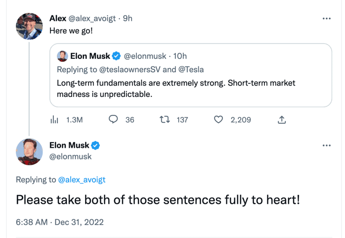 Lorsqu’Elon a répondu à mon tweet indiquant que les gens devraient éviter l’effet de levier pour rester solvables et penser à long terme, il a fait écho à ce que j’écris et dis depuis des années à propos d’un investissement dans l’action Tesla. Beaucoup sont influencés par le bruit qu’ils entendent quotidiennement, sont confus et prennent de mauvaises décisions et c’est pourquoi j’écris cet article.