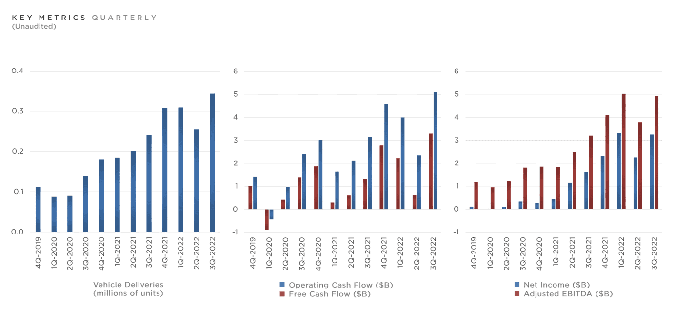 Tesla en tant qu’entreprise s’est améliorée chaque jour, semaine et mois en 2022, ce qui contraste fortement avec la performance historiquement faible de ses actions en 2022. Avec des marchés boursiers tournés vers l’avenir et la crainte d’une profonde récession, la plupart des analystes expliquent le problème par une détérioration de la demande et des bénéfices, mais négligent le fait que Tesla n’a aucune dette et la marge bénéficiaire la plus élevée du secteur, ce qui lui confère un excellent avantage concurrentiel.