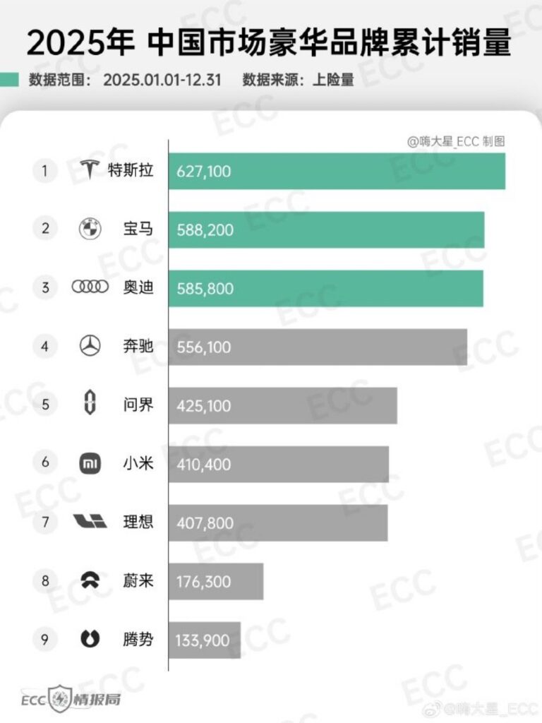 Selon les chiffres consolidés de l’année 2025, Tesla est officiellement devenue la marque de luxe n°1 en Chine, détrônant les géants bavarois et souabes sur leur terrain de chasse le plus rentable.