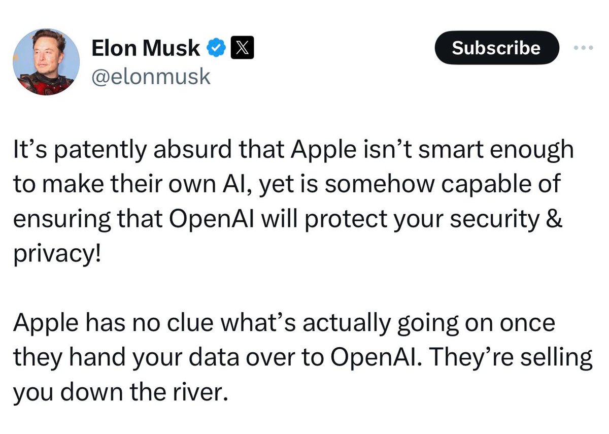Dans son post, Musk a déclaré : « Il est absolument absurde qu’Apple ne soit pas assez intelligent pour développer sa propre intelligence artificielle, mais soit néanmoins capable de garantir qu’OpenAI protégera votre sécurité et votre confidentialité ! Apple n’a aucune idée de ce qui se passe réellement une fois qu’ils ont transmis vos données à OpenAI. Ils vous vendent en douce. »
