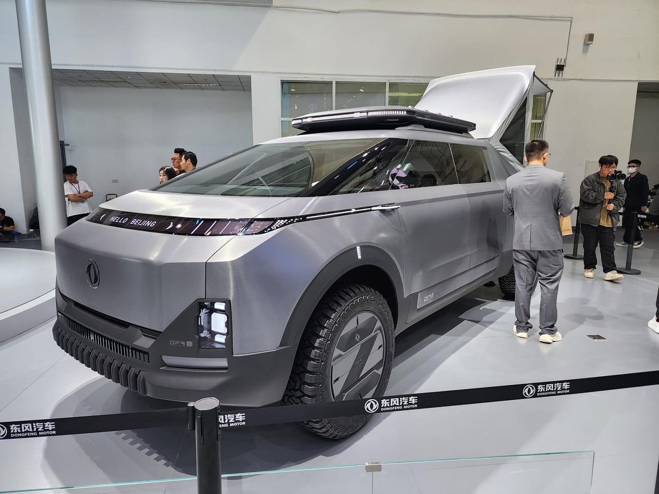 The second photo shows us the vehicle from the front and side, revealing a flat, high front hood, topped with a sloping windshield. The front part is dominated by an imposing grille and rectangular headlights, framing the logo which also reads “HELLO BEIJING”. The front fender is raised, presumably to reveal the engine compartment or storage space, which is typical of electric vehicles that don’t need a large engine compartment up front. The people around the vehicle add to the atmosphere of display and discovery.