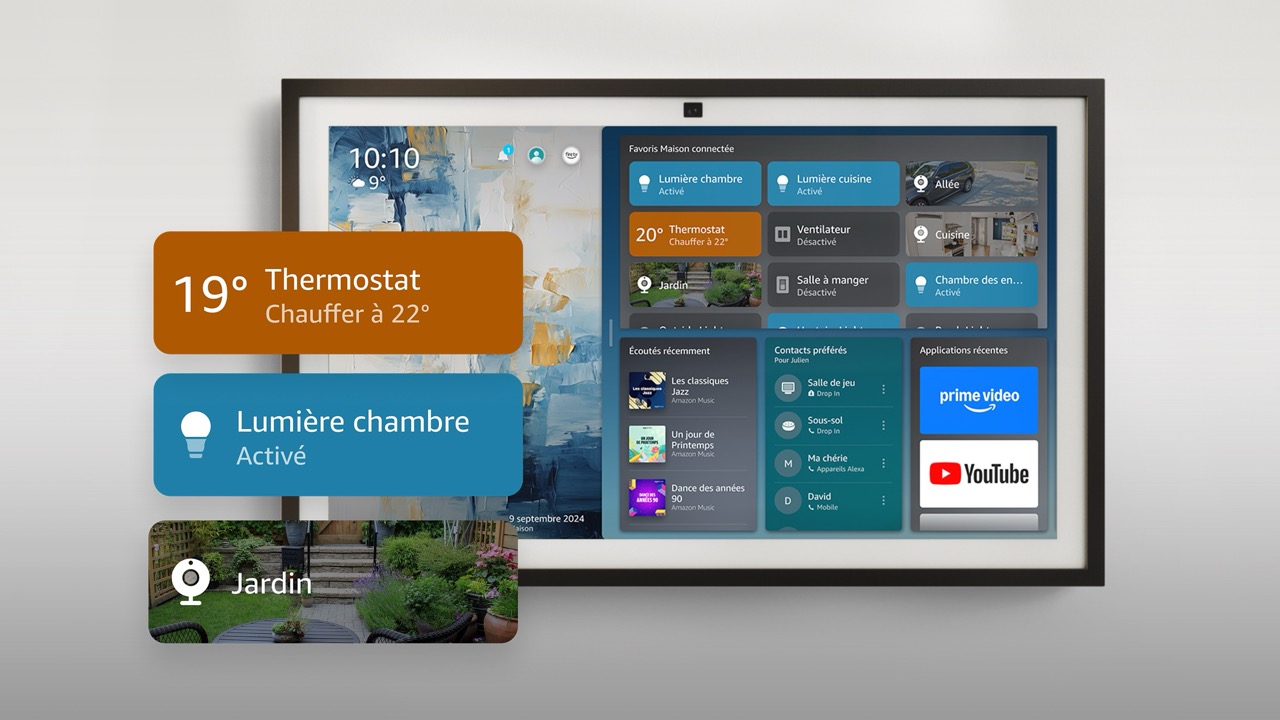 L’Echo Show 21 ne se contente pas de divertir : il centralise également le contrôle de votre maison connectée. Depuis le tableau de bord ou par commande vocale avec Alexa, vous pouvez gérer vos appareils connectés en un clin d’œil. Allumez les lumières, surveillez vos caméras de sécurité ou ajustez la température de votre thermostat sans lever le petit doigt.