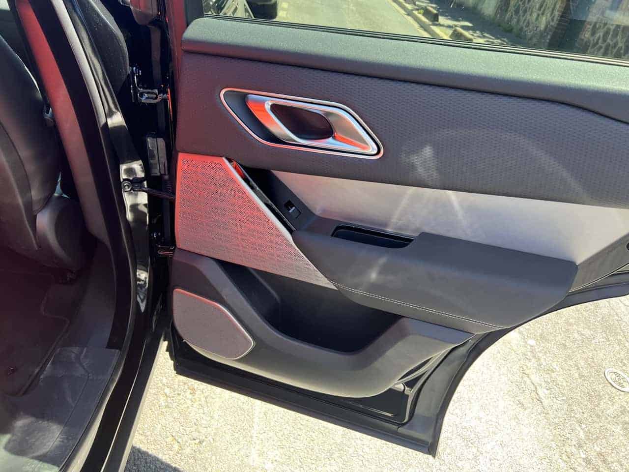 Il y a de nombreux espaces de rangement et un chargeur à induction, ainsi que des prises USB et une petite touche esthétique que j’ai particulièrement apprécié : le logo Velar brillant en bleu au pied des portes du conducteur et du passager. Il y a aussi des placages en aluminium sur le haut des portes ici et là, qui accentuent l’effet « voiture de sport », clin d’œil aux autres modèles de la marque.