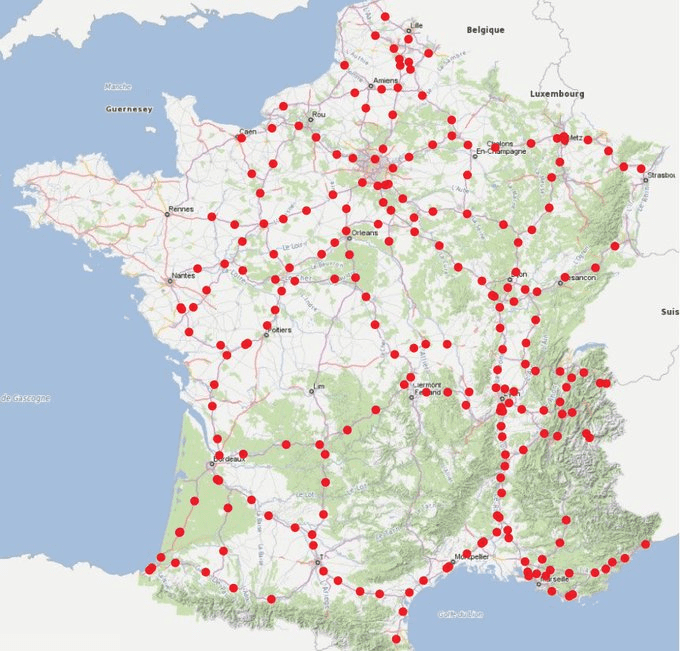Sont représentées sur cette carte l’ensemble de ces stations ouvertes ou à venir cette année (icones neutres) possédant plus de 2 bornes de recharge d’une puissance supérieure à 100kW. Ces infrastructures sont celles qui permettent réellement d’envisager les très longs déplacements sereinement, avec un temps de recharge de l’ordre de 15 à 30 minutes. Afin de garder la notion d’échelle, les cercles matérialisent le rayon d’action sur autoroute d’un VE de moyenne gamme (de l’ordre de 250km) depuis quelques métropoles françaises.