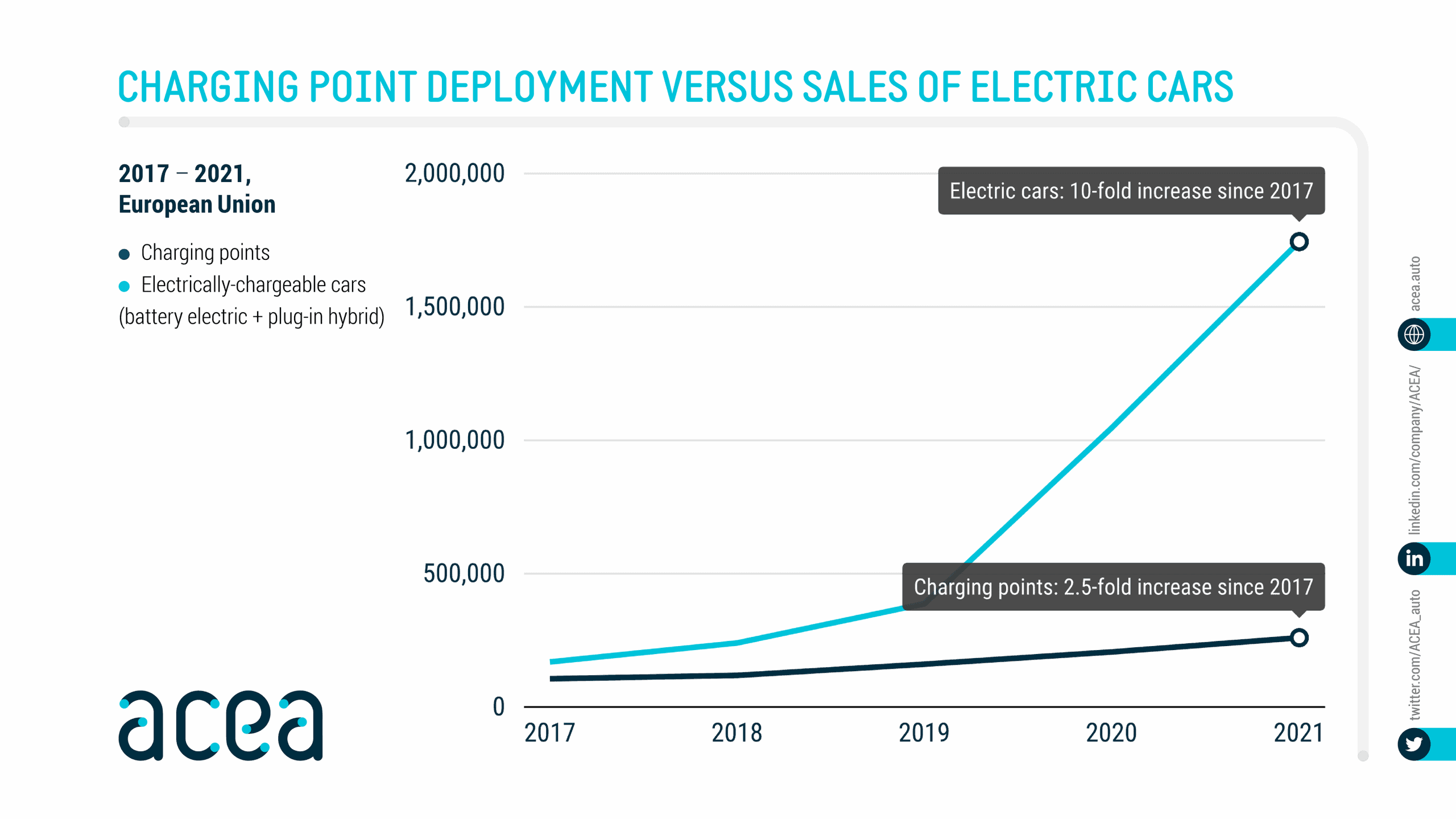 C’est bien ce que pense l’ACEA. Sans forcément alerter, cette association présidée par le CEO de BMW Group explique dans un graphique intéressant que le véhicule électrique progresse 10 fois plus vite que le réseau de recharge. C’est un peu moins frontal que le patron de PSA mais l’objectif visé semble le même: ralentir.