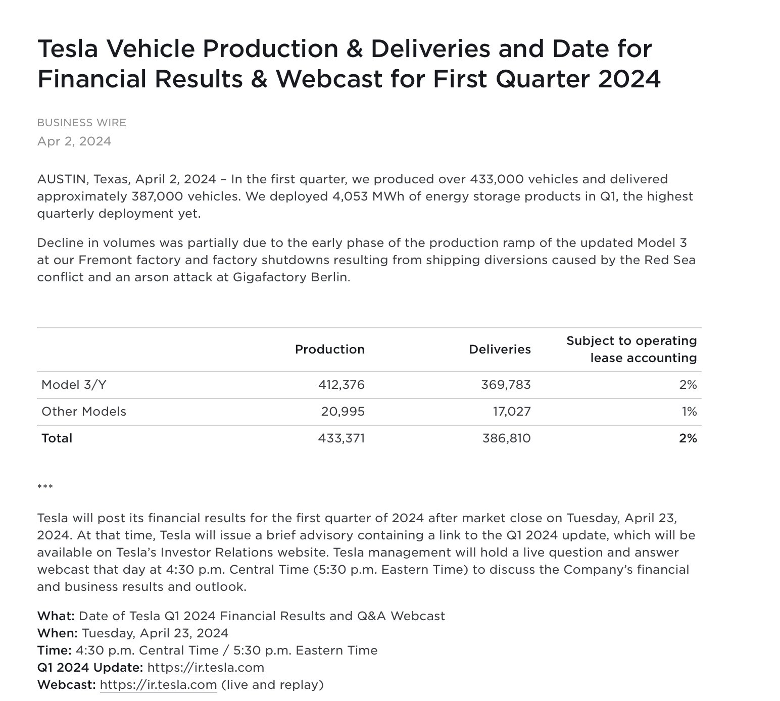 Outre les défis internes, Tesla a également dû faire face à des perturbations externes significatives. La société a mentionné des arrêts d’usine résultant de détournements d’expédition causés par le conflit de la mer Rouge, ainsi qu’une attaque incendiaire à la Gigafactory de Berlin. Ces événements ont mis en lumière la sensibilité de la production mondiale aux tensions géopolitiques et aux actes de sabotage, soulignant la complexité de maintenir une chaîne d’approvisionnement stable dans un environnement international tumultueux. Ces raisons sont les raisons officielles publiées sur le site de Tesla.