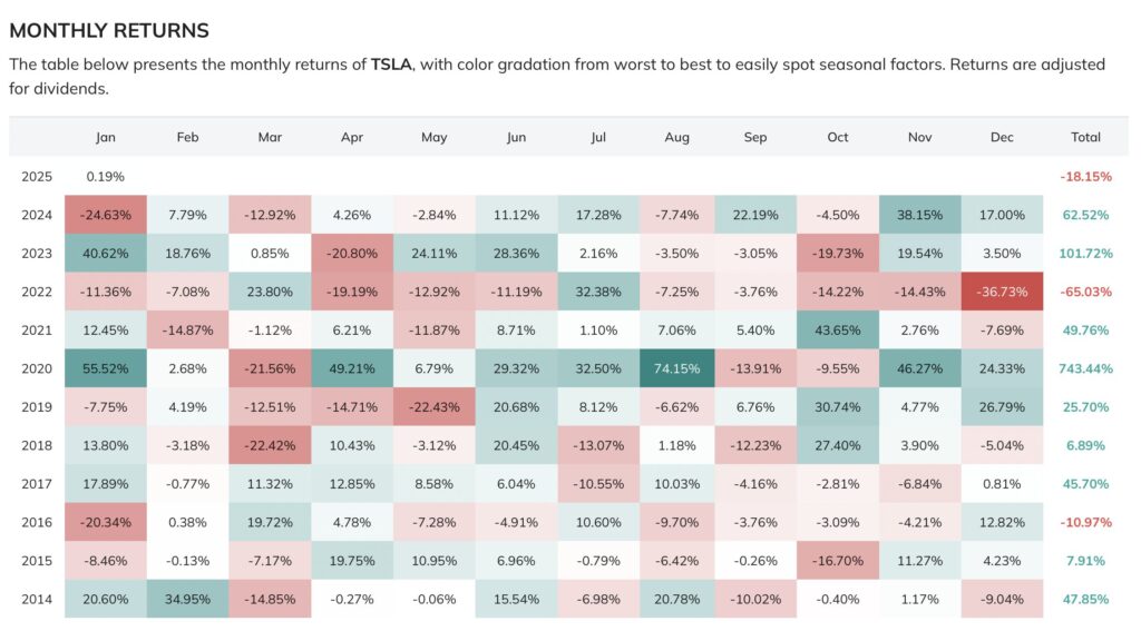 Pour Tesla, il est important de noter que la société ne verse pas de dividendes, ce qui signifie que le rendement pour les actionnaires provient exclusivement de l’appréciation du cours de l’action.