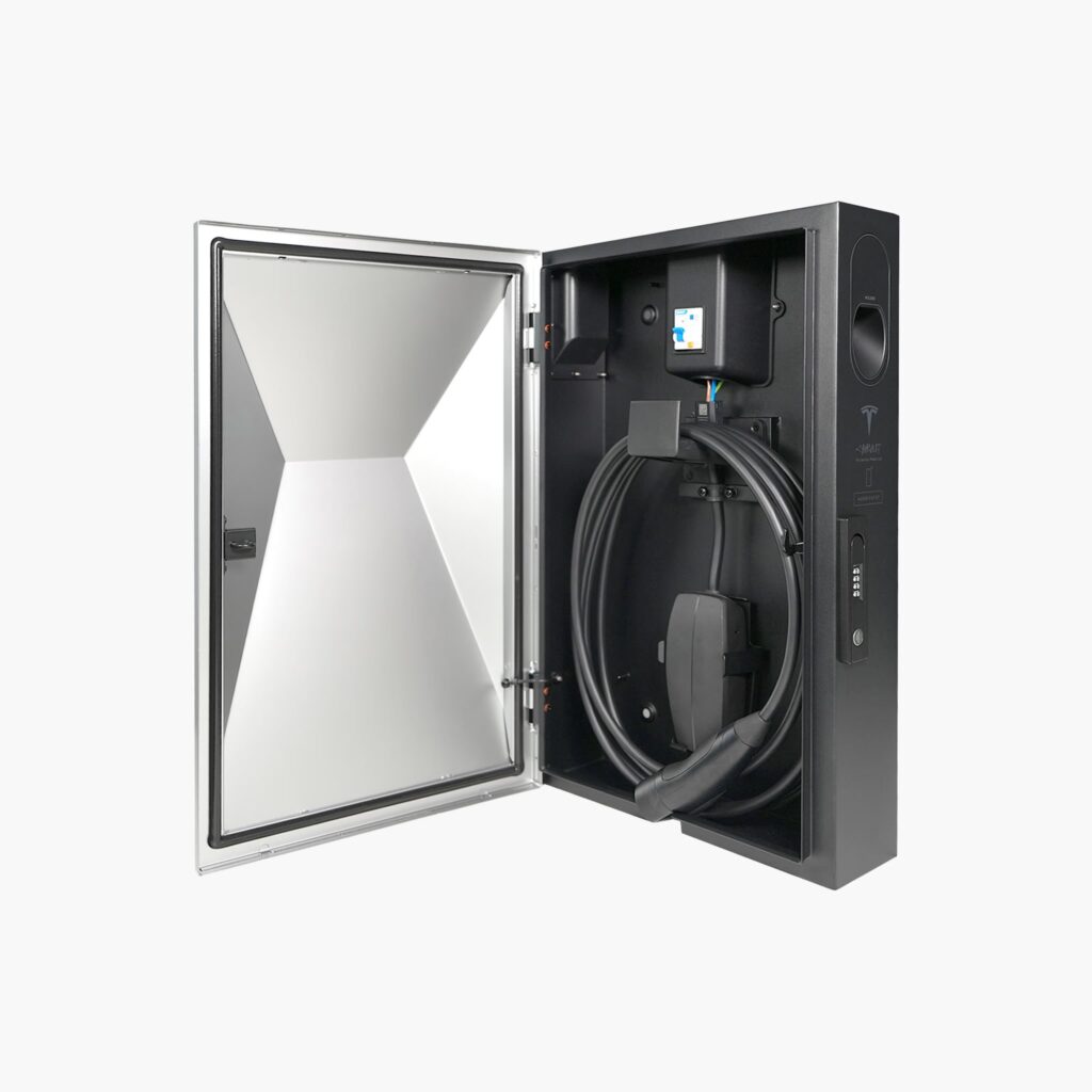 C’est ici que le CyberVault surpasse le Wall Connector standard que nous connaissons. À l’intérieur du coffre-fort se cache un chargeur qui n’est pas fixé de manière permanente.