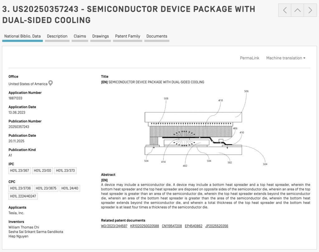 Tesla vient de franchir une étape significative dans le secteur de l’ingénierie thermique en présentant un nouveau brevet intitulé « Semiconductor Device Package with Dual-Sided Cooling« . Publiée le 20 novembre 2025, cette innovation pourrait bien être le chaînon manquant permettant de réaliser la vision ambitieuse d’Elon Musk : réduire la consommation des puces AI de nouvelle génération à 250 watts.
