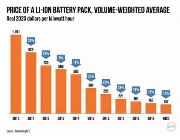 - Le prix des batteries baisse d’environ 13 % par an. Si vous devez remplacer une batterie dans 15 ans, elle devrait coûter beaucoup moins cher qu’aujourd’hui.